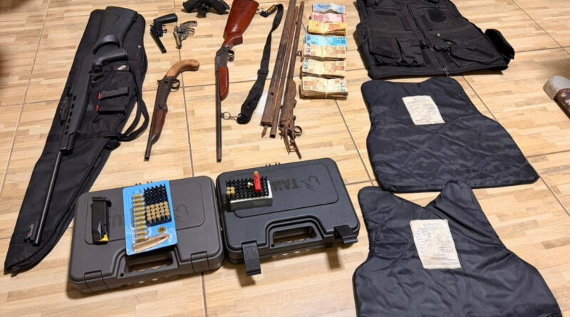 Diante da situação de flagrante e da informação de que o agressor possuía armamento na residência, os policiais deslocaram-se até o imóvel, na rodovia BR-376. No local, foram apreendidos uma pistola calibre .38 TPC, um revólver calibre .22, duas garruchas, uma carabina calibre .22 e uma carabina artesanal. Também foram localizados um colete balístico, carregadores e diversas munições de calibres variados (9mm, .38 TPC, .22 e .32).
