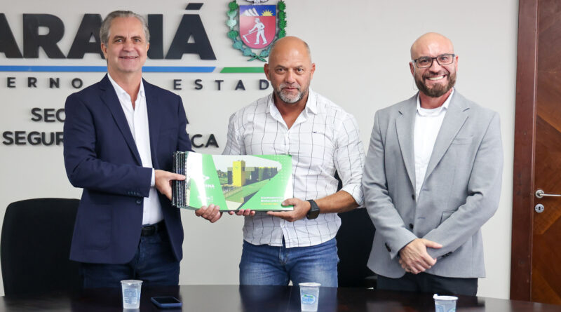 O secretário do Planejamento, Ulisses Maia, e o diretor de Planejamento e Projetos do Paraná Projetos, Célio Watter, estiveram reunidos com o secretário de Segurança Pública, Hudson Leôncio Teixeira, na sede da Secretária de Estado da Segurança Pública (SESP), para realizar a entrega oficial.